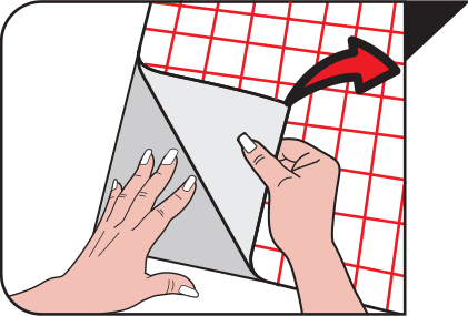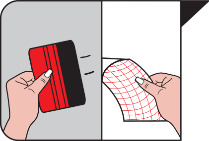Irrota tarrakalvo hitaasti taustapaperista samanaikaisesti painamalla kalvoa pintaan kiinni lastalla. Aloita painelu kalvon keskustasta siirtyen reunoja kohden välttääksesi ilmataskuja. Tasoita ilmataskut asennusvaiheessa siirtämällä ilma lastalla keskiosasta kohti kalvon reunaa.