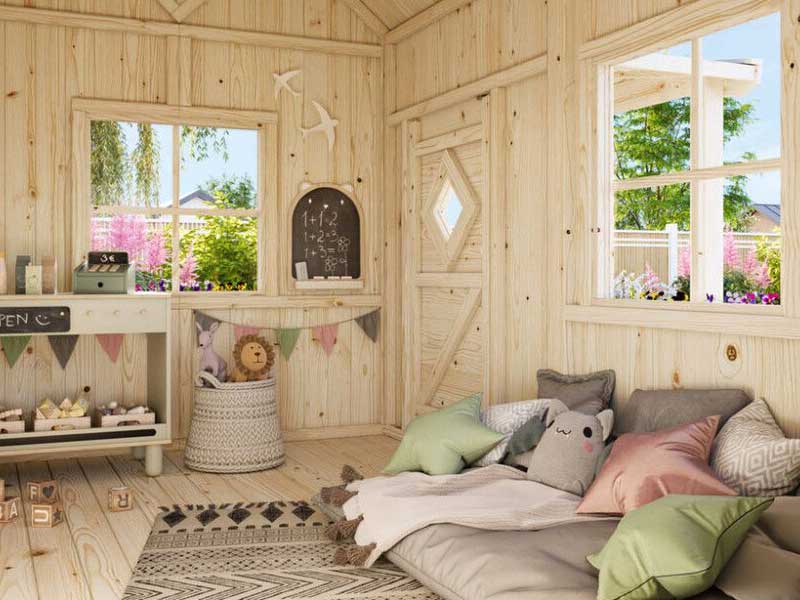 Nyt kun leikkimökki on valmis ja pystyssä on mielikuvituksen vuoro tulla esiin! Leikkimökki toimitetaan maalaamattomana, joten leikkimökin tekeminen omanlaiseksi onnistuu helposti maaleilla ja koristeilla. Leikkimökin pintaan on hyvä käyttää maaleja ja kyllästeitä jotka estävät puupinnan värimuutokset ja suojaavat sään vaikutuksilta. Tässä vaiheessa leikkimökin rakennusta voivat lapset tulla mukaan ja päättää minkälaisen mökin he haluavat. Leikkimökillä on rajattomia mahdollisuuksia muuttua vaikkapa kioskiksi, prinsessalinnaksi taikka merirosvomajaksi. Tee siis leikkimökistä omanlainen ja sisusta lapsen maun ja vision mukaan!
