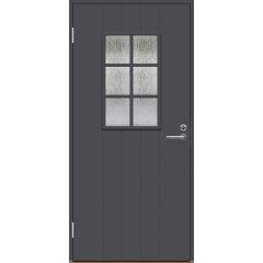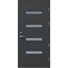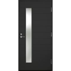 - Nosta karmi oviaukkoon valitsemasi kätisyyden mukaisesti. Ruuvaa karmin ylimmät sarana- ja lukkosivun ruuvit kevyesti paikalleen. Käytä kiiloja saadaksesi karmin suoraan linjaan. Kiinnitä karmin saranasivu karmiruuveilla. Muista tarkistaa karmin suoruus huolellisesti vatupassilla.