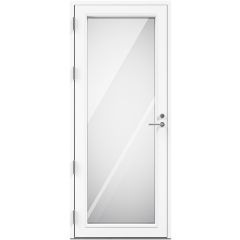 - Suojaa oviaukko esimerkiksi matolla huolellisesti ennen kuin nostat lasin varovaisesti pystyasentoon. Asenna lasi karmiin ja kiristä saranaruuvit.