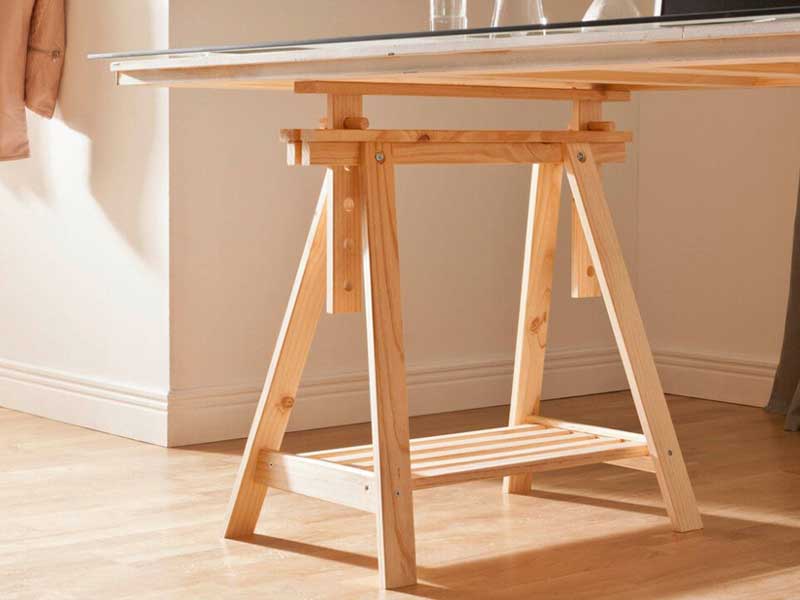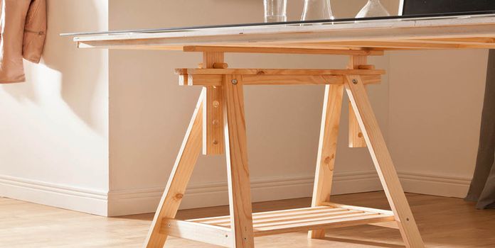 - Pöytälevyn kuivumista odotellessa voi rakentaa liimapuulevystä pöytälevyn alle sijoitettavan tukikehikon sahaamalla kaksi samanpituista pitkää sivua ja kaksi samanpituista lyhyttä sivua. Mikäli haluat päästä sahaustyössä helpommalla, tavallista sahaa parempi vaihtoehto on tehokas pistosaha. Kehikon sivujen mitat määrittyvät pöytälevyn koon mukaan, ja kehikkoa suunnitellessa pöytälevyn kaikkiin neljään kulmaan on muistettava jättää sopiva tila pöydänjaloille, jotka sijoittuvat kehikkolautojen väleihin. Tukikehikko liimataan ja porataan kiinni pöytälevyn alapuolelle.