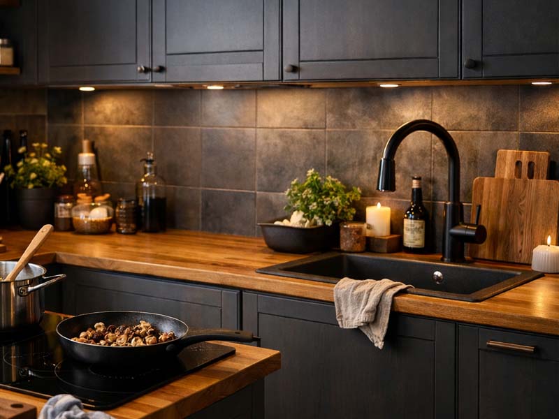 Hanki jo ennen työtason rakentamista ja tiskialtaan upottamista työtason ilmeeseen yhteensopivien reunalistojen lisäksi myös seinälista sekä sitä peittävä kaunis, ilmeeltään työtason väritykseen saumattomasti sointuva peitelista BAUHAUSista.